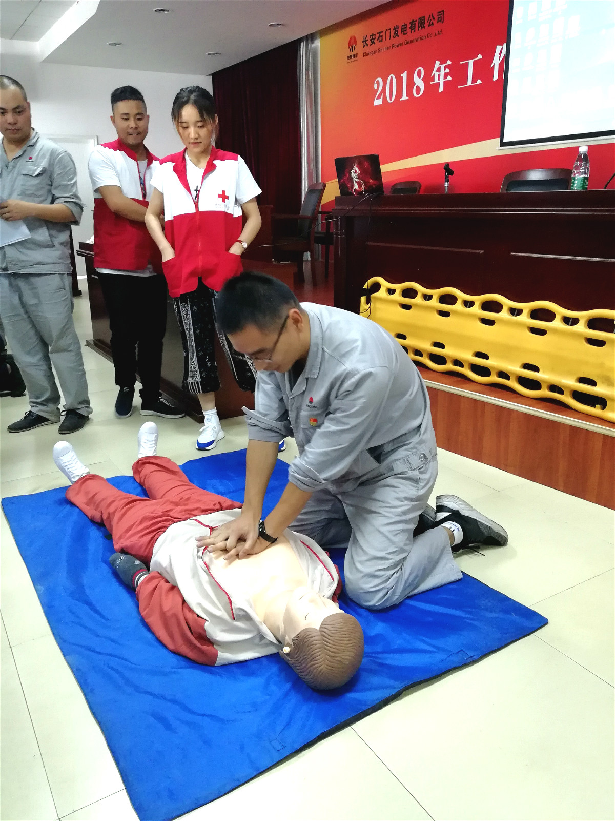 此次培訓(xùn)邀請了石門縣紅十字會醫(yī)護(hù)人員為大家做現(xiàn)場講解與演示。在培訓(xùn)過程中,醫(yī)護(hù)人員演示了心肺復(fù)蘇法的救助過程及要領(lǐng),并告訴大家使用心肺復(fù)蘇法搶救傷員,關(guān)鍵是要快、準(zhǔn)、對。“快”就是要搶時間,分秒必爭,一邊120,一邊施救,不能拖拖拉拉。“準(zhǔn)”是要找準(zhǔn)心臟位置,心臟在人體胸骨靠下1/3處。“對”就是兩手姿勢對,兩手掌交叉重疊放在傷員心臟處;按壓用力對,按壓時用力要適當(dāng),以按下幅度為5mm有效;再就是按壓與人工呼吸次數(shù)比對,按壓30次,人工呼吸2次,持續(xù)做5輪為一個搶救程序,直到傷員頸動脈有跳動為止。在演示高空墜落,救援傷員的環(huán)節(jié)中,該公司安環(huán)部負(fù)責(zé)人自告奮勇充當(dāng)了一次“傷員模特”,用實(shí)際的行動參與到教學(xué)的環(huán)節(jié),同時也很好的將現(xiàn)場學(xué)習(xí)氛圍帶動了起來。