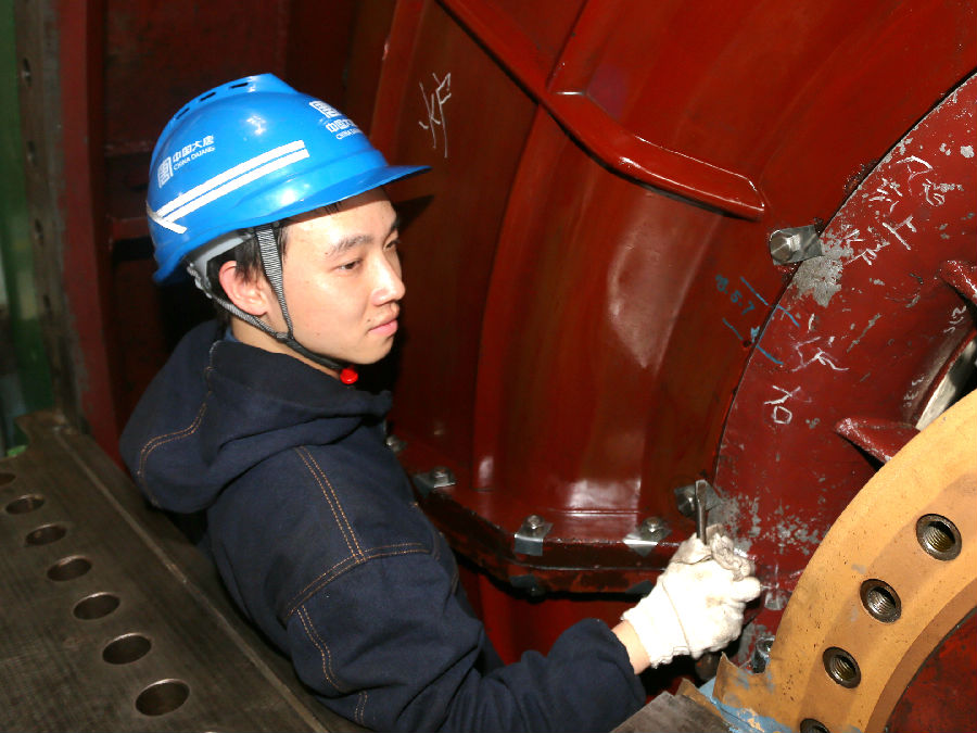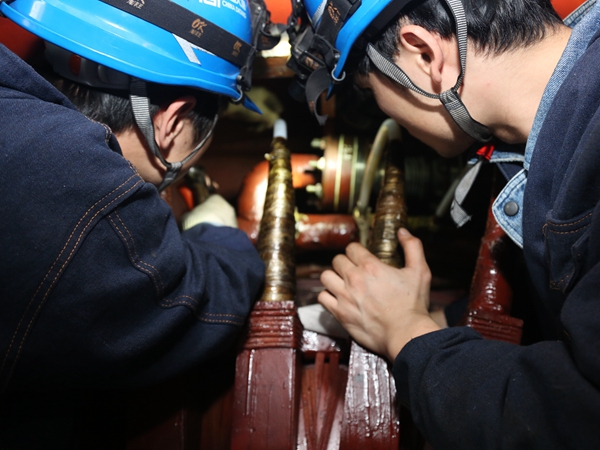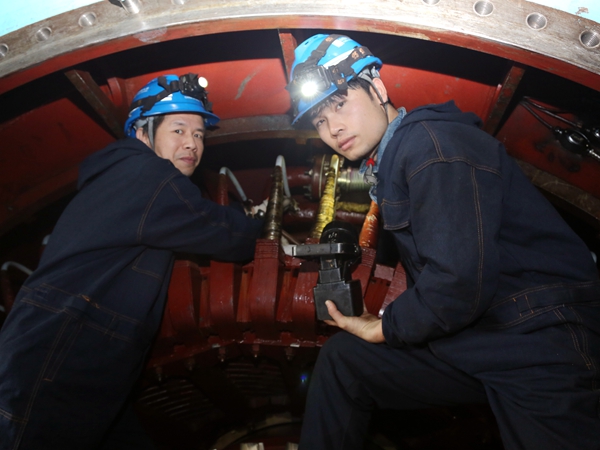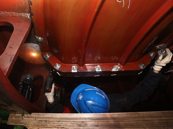 換完發電機出水溫度探頭,身材苗條、動如脫兔的陳杰也“潛”下去,和劉潛一起,加入端蓋的緊固工作。