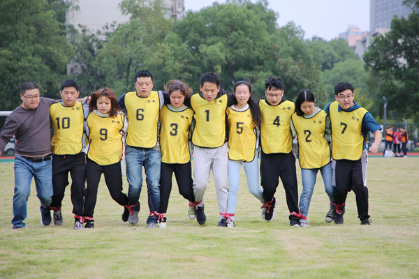 參賽隊員相鄰之間的腿綁在一起,齊心沖到終點,期間不能摔倒,用時最短的隊伍取勝。