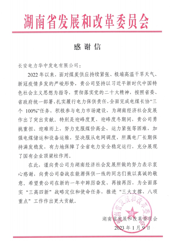 1月9日,華中公司收到湖南省發改委發來的感謝信,感謝華中公司扎實履行電力保供責任,積極參與電力市場建設,有力保障了全省電力安全穩定運行,為湖南經濟社會發展作出了突出貢獻。